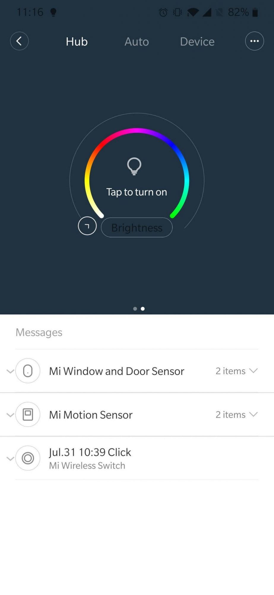 - M-am folosit de senzorii de mișcare pentru a aprinde lumina de pe Smart Hub, care are un LED circular RGB cu intensitate reglabilă. Astfel l-am folosit ca lumină de veche, care se aprinde noaptea când mergi prin casă și unul din cei doi senzori sesizează mișcare.
