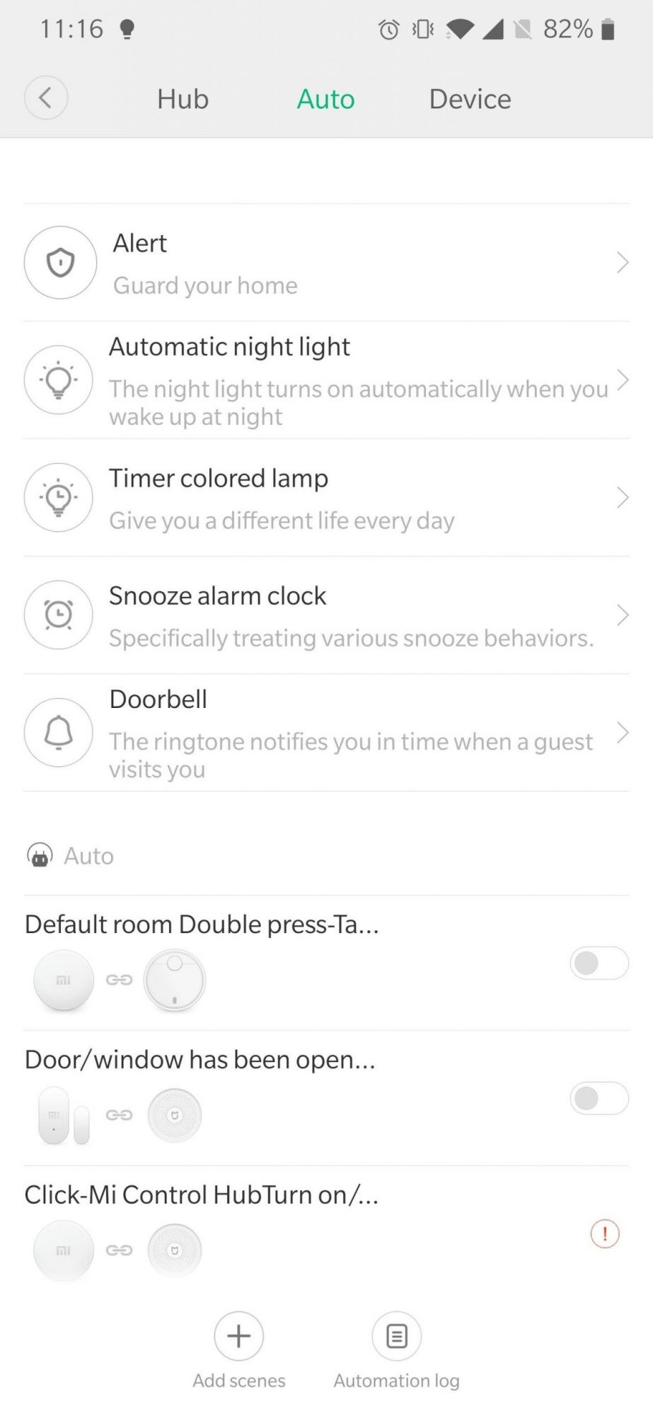Deci, practic, aveți o grămadă de posibilități pentru programarea sistemului, mai ales dacă mai dețineți și alte gadget-uri smart Xiaomi. Totul se poate face prin adăugarea de șcene de tipul „IF” ceva „THEN” altceva. De exemplu, poți opri purificatorul de aer sau ventilatorul (da, Xiaomi au și ventilator) dacă se deschide un geam.