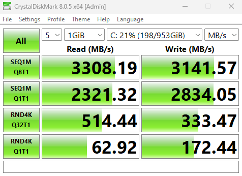SSD-ul Lexar NM620 de 1TB, folosit în acest sistem, a oferit viteze foarte bune pentru prețul său, demonstrând că poate face față cerințelor moderne de stocare rapidă. În ciuda prețului accesibil, acest SSD se comportă excelent în scenarii de utilizare zilnică, precum și în gaming, oferind timpi de încărcare rapizi și o experiență fluidă.