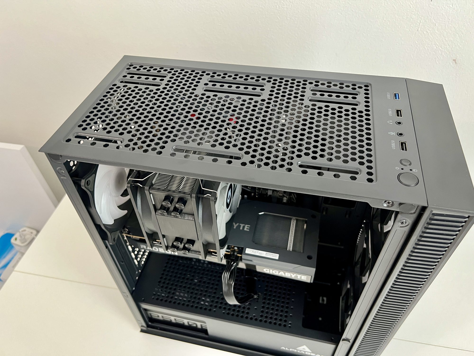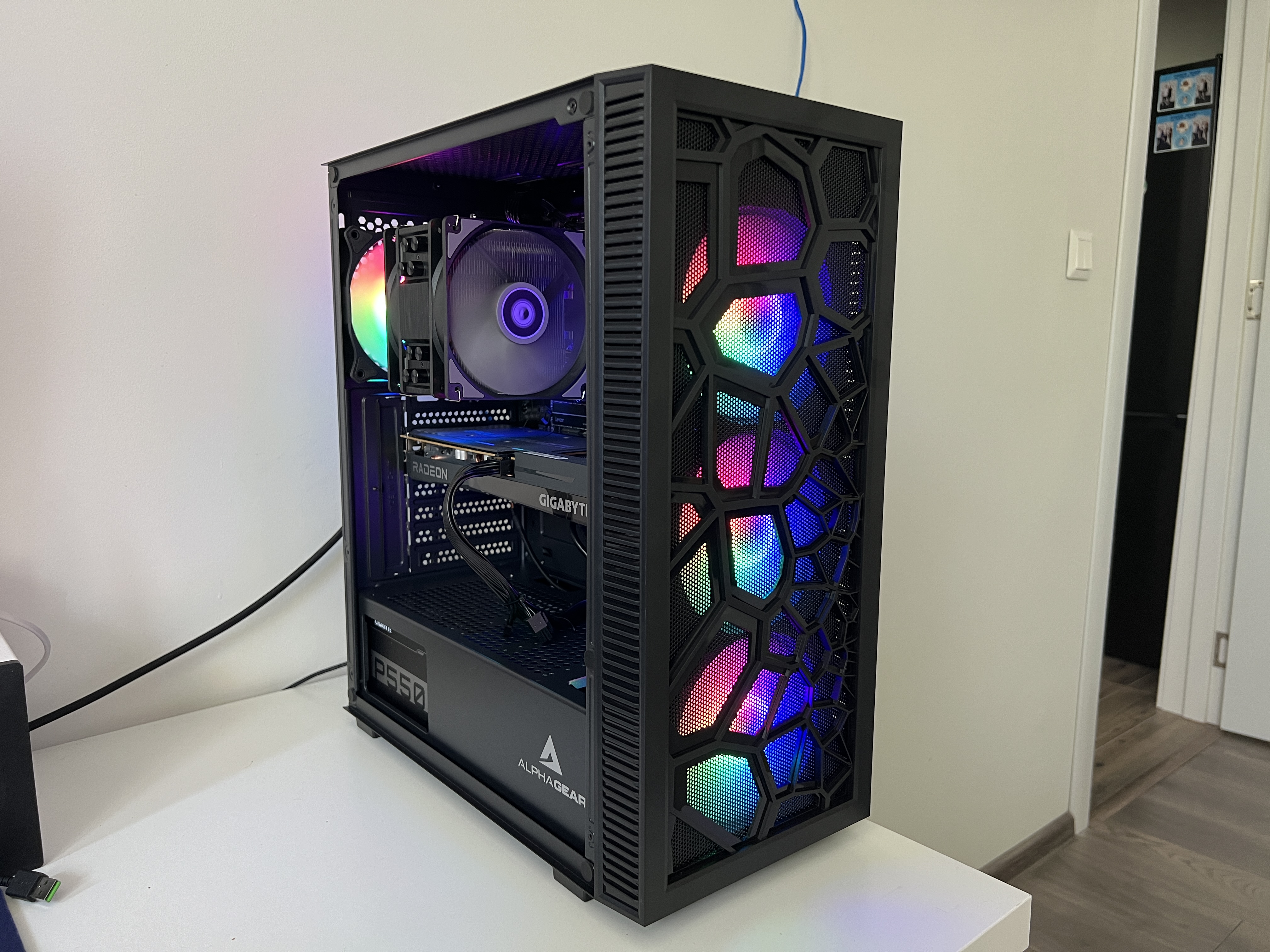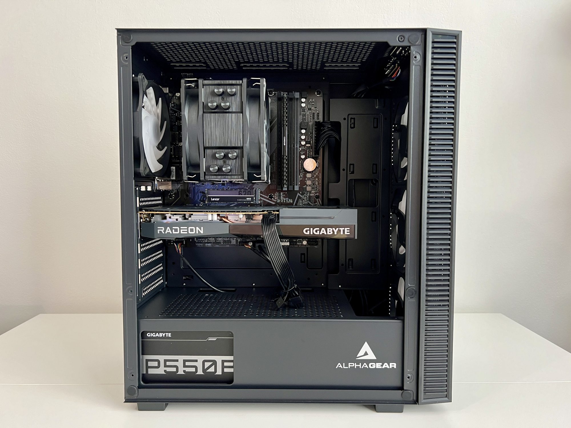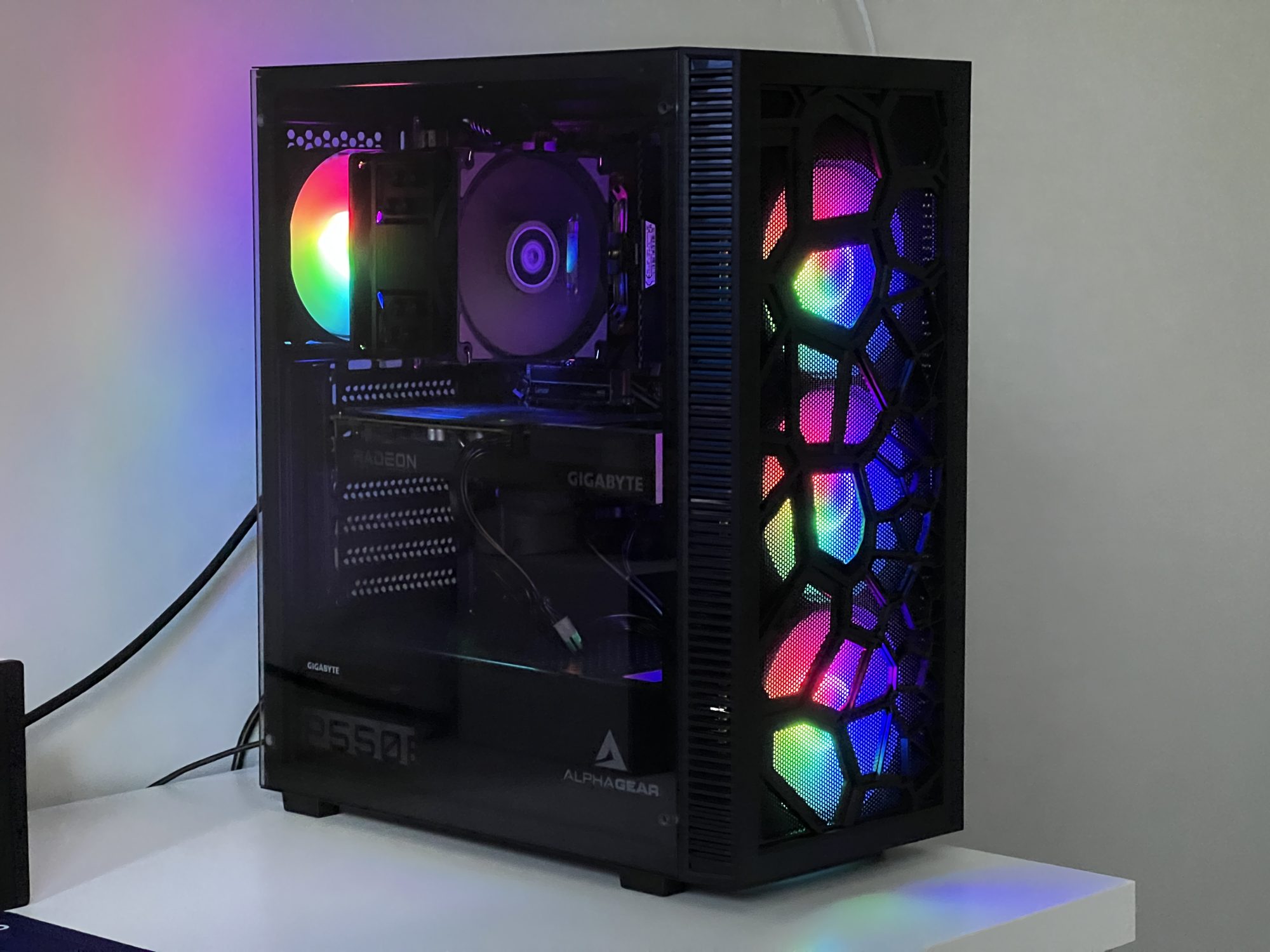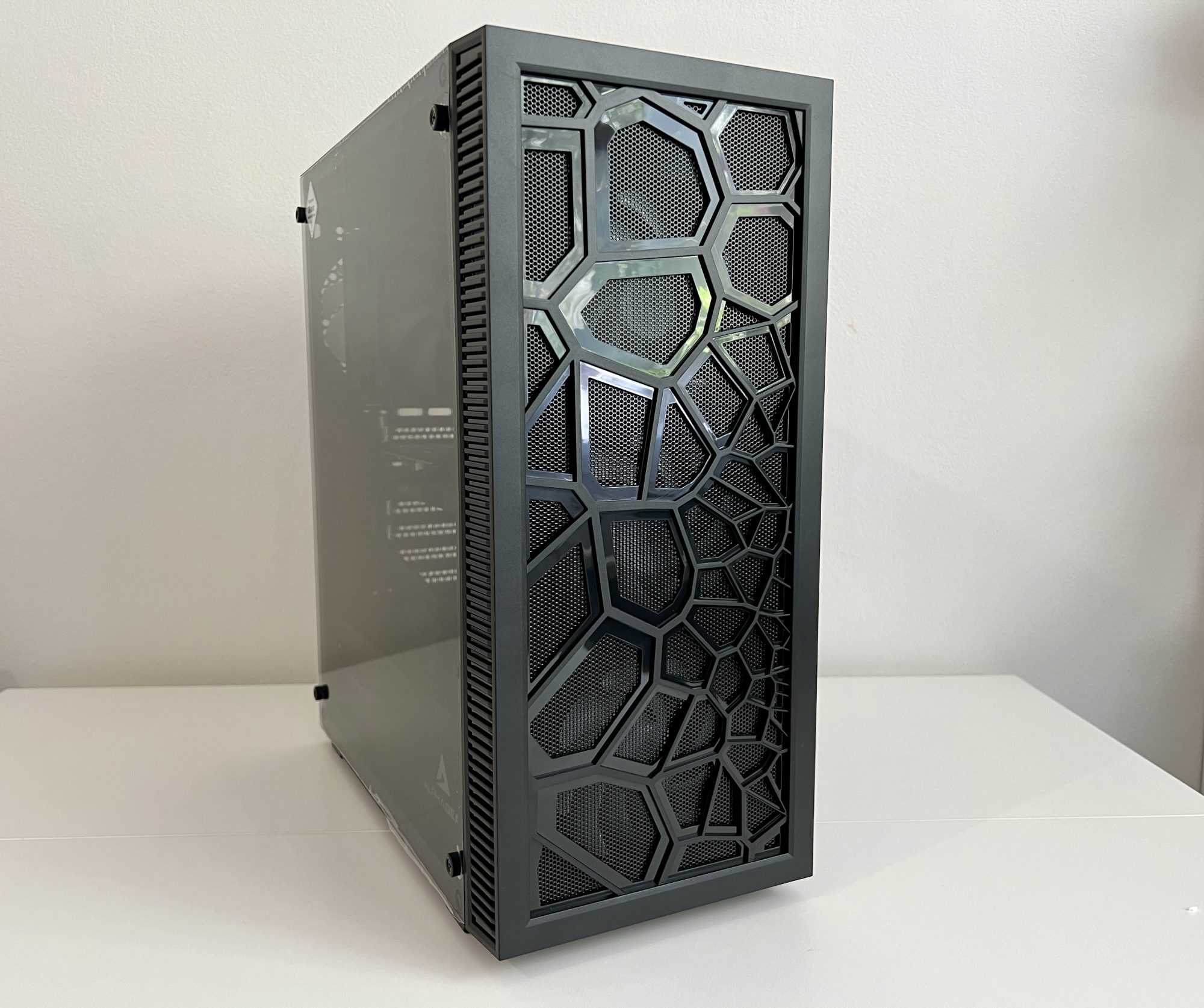 Carcasa Alphagear Adept, de la brandul propriu PC Garage, este un model accesibil, dar bine construit. Cu un panou lateral din sticlă, o parte frontală cu un design atractiv și patru ventilatoare FRGB preinstalate, carcasa oferă un aspect plăcut și un flux de aer adecvat. Ventilatoarele, deși nu sunt cele mai silențioase, sunt suficient de eficiente pentru a menține temperaturile în limite normale.
