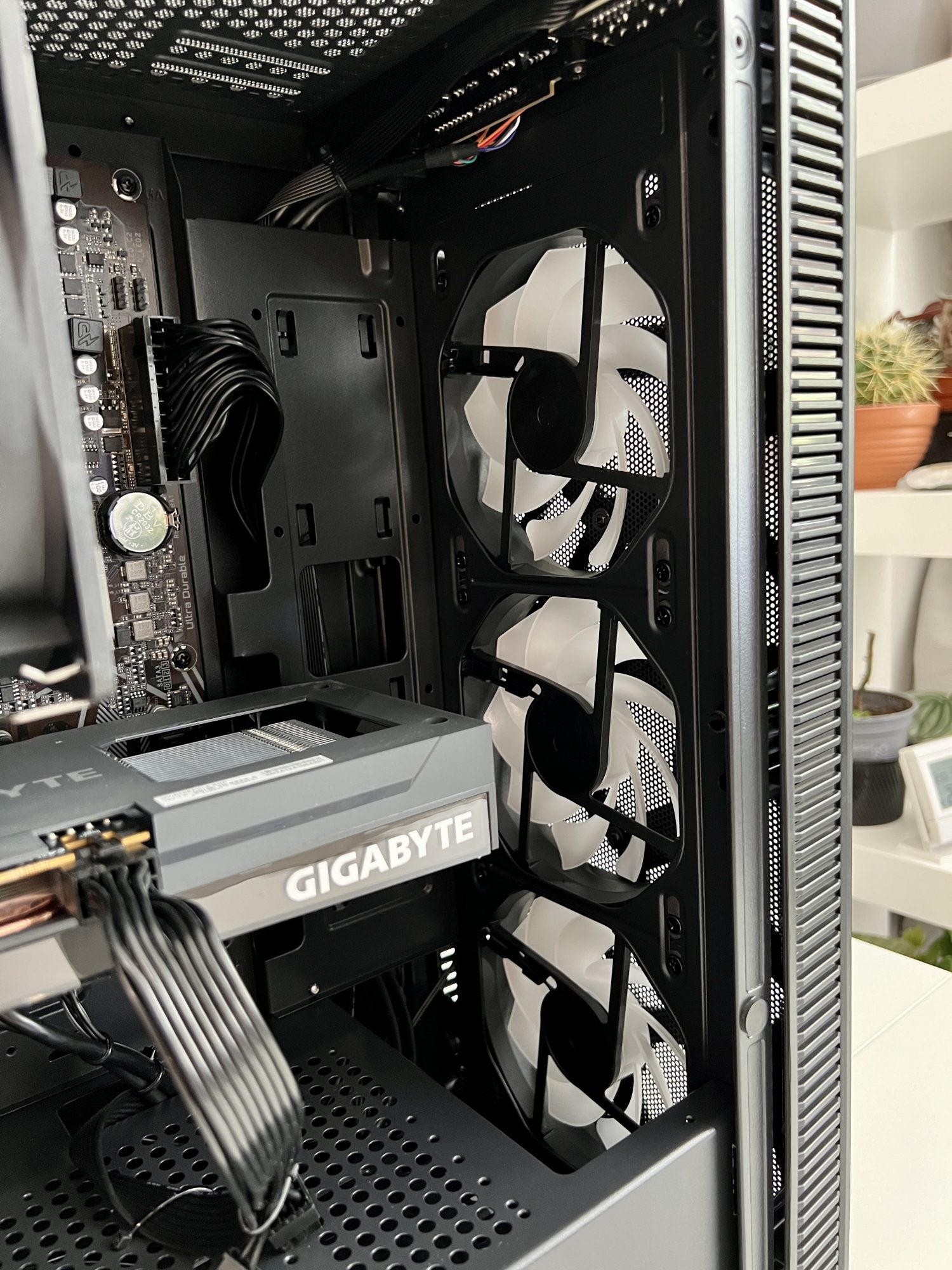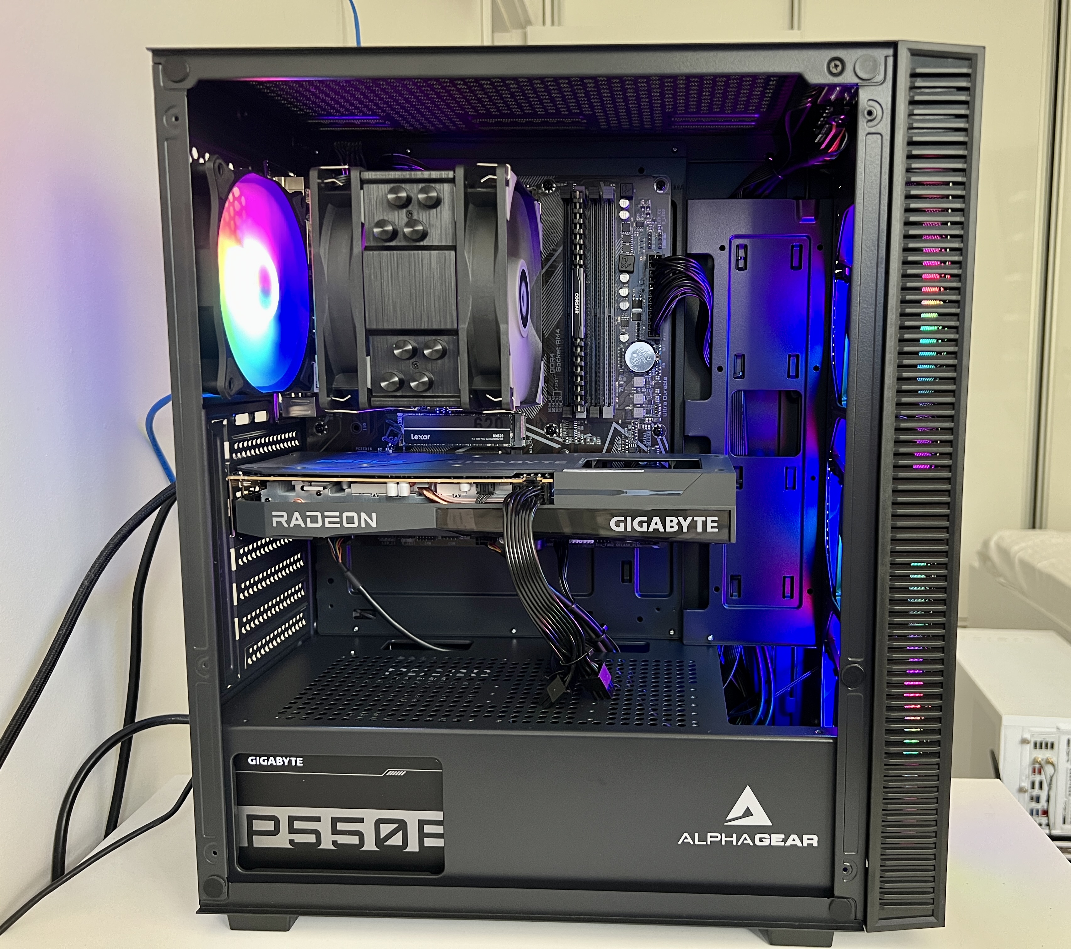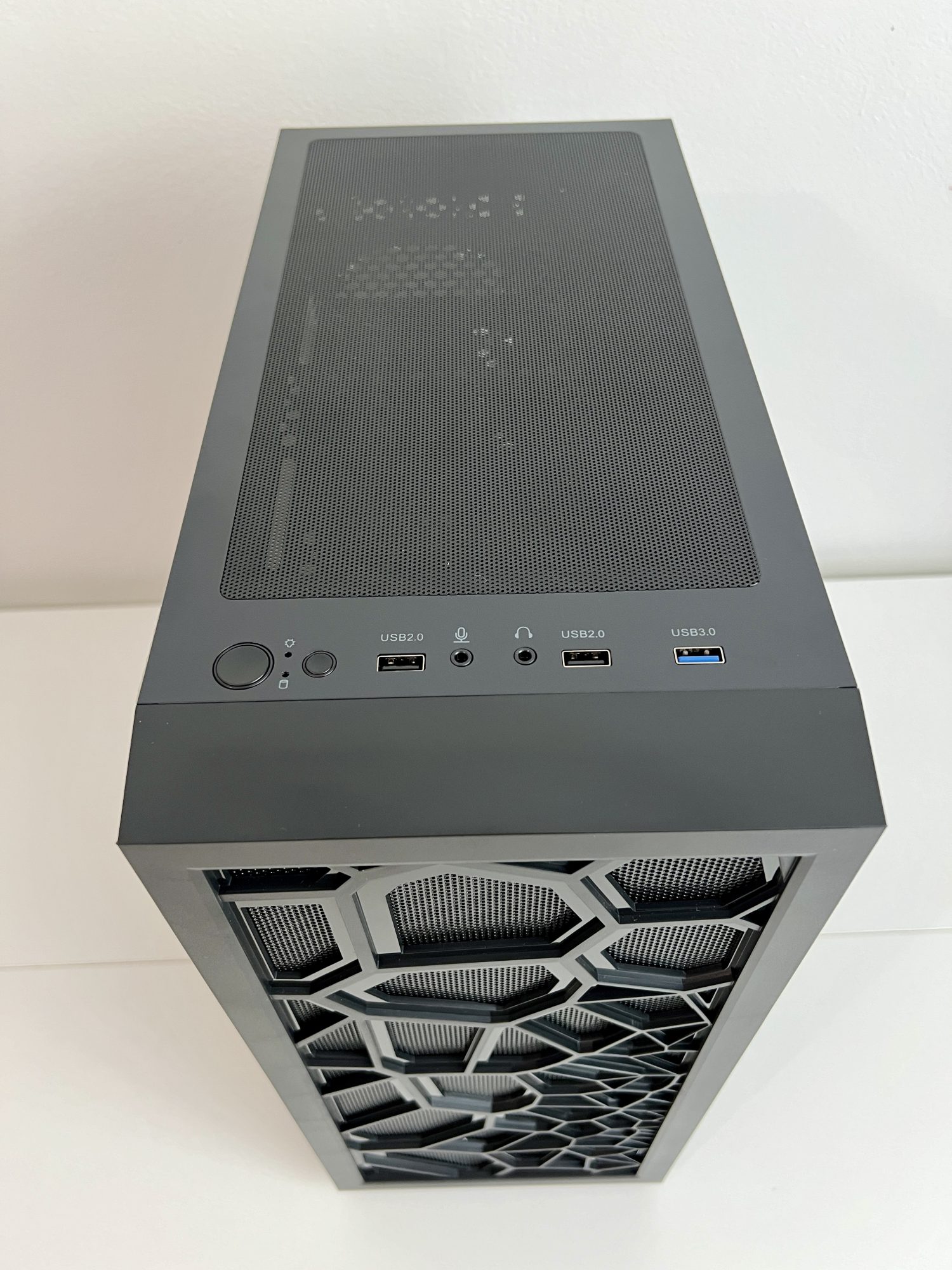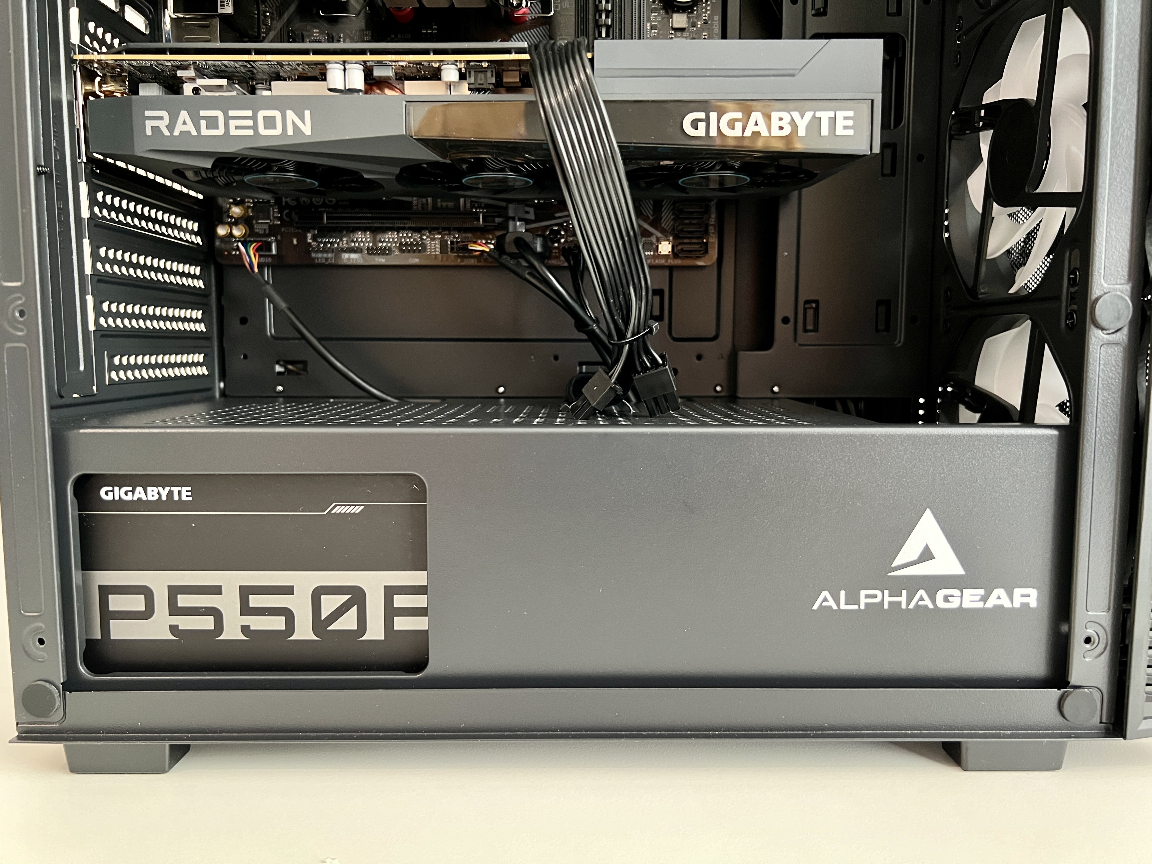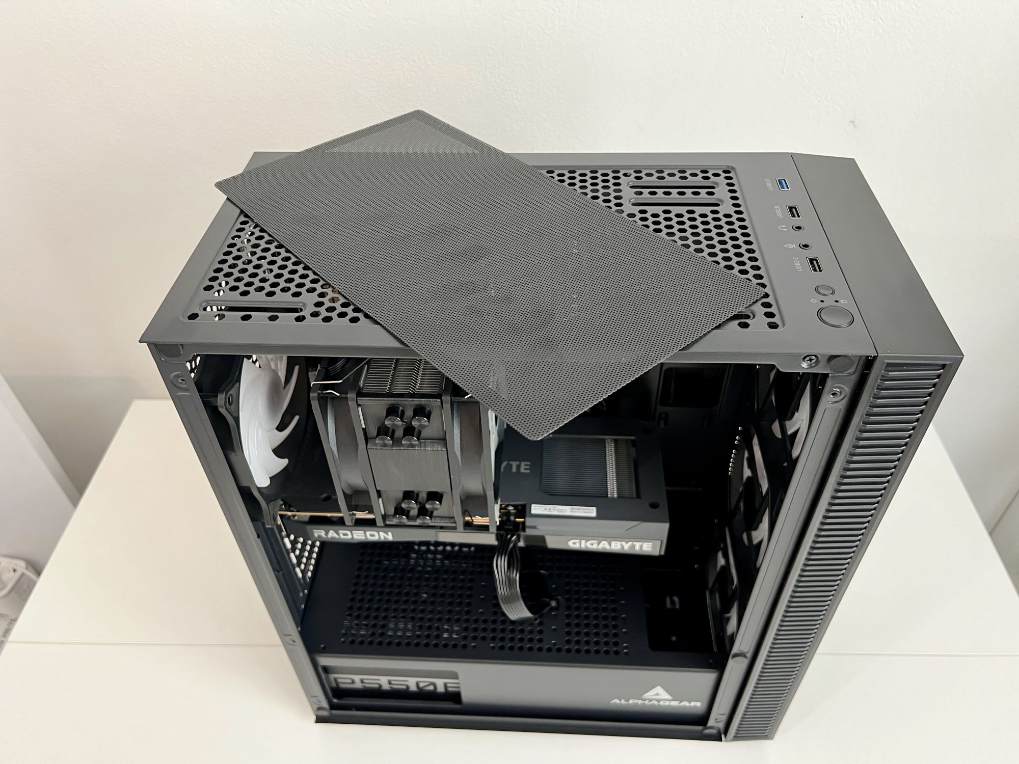 Carcasa Alphagear Adept, de la brandul propriu PC Garage, este un model accesibil, dar bine construit. Cu un panou lateral din sticlă, o parte frontală cu un design atractiv și patru ventilatoare FRGB preinstalate, carcasa oferă un aspect plăcut și un flux de aer adecvat. Ventilatoarele, deși nu sunt cele mai silențioase, sunt suficient de eficiente pentru a menține temperaturile în limite normale.