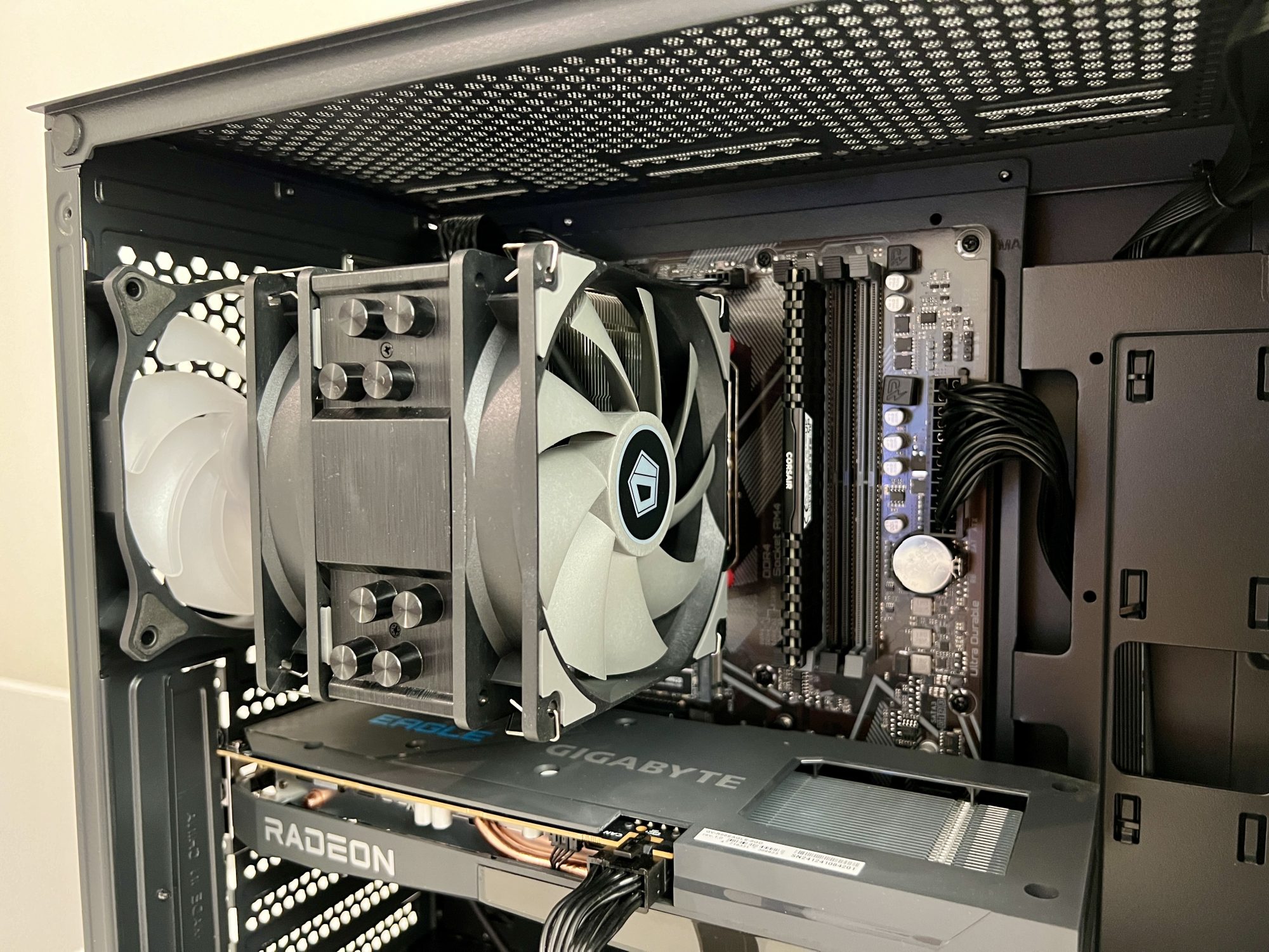Coolerul ID-Cooling SE-214-XT este un alt element care m-a impresionat. Deși are un preț extrem de accesibil, este un cooler masiv și eficient, cu două ventilatoare, care reușește să mențină procesorul Ryzen 5 5600 la temperaturi scăzute, chiar și în sarcini mai intense. Culoarea și designul său se integrează perfect în carcasa Adept, oferind un aspect estetic plăcut.